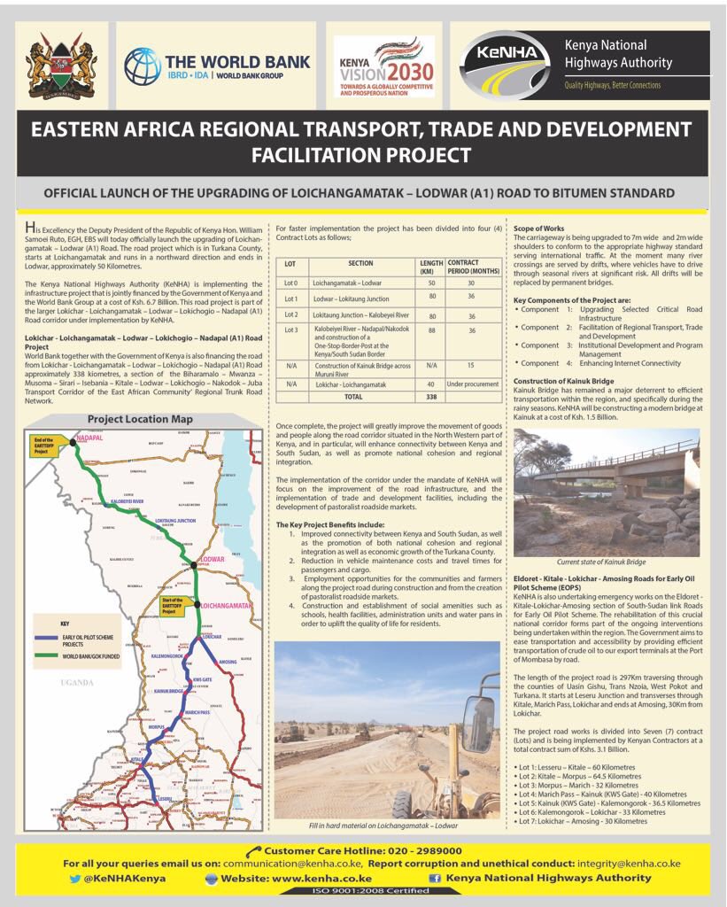 The road "will link Eldoret to Juba through the Nakodok/Nadapal border with South Sudan. The road will enhance connectivity between Kenya and South Sudan, thereby enhancing cross-border trade between the two countries..and " has finally begun, moving forward a project that has been on the cards for nearly three decades" Finance